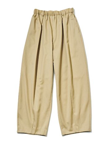 ゴムウエストではき心地はラクなのに、ベルトループがついているため知的に装うことも可能。ももまわりがふくらむカーヴィなシルエットでもボリュームが出すぎないのは、薄くてくたっとした風合いだから。センターシームでいっそうすらりと。