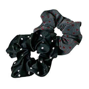 グレーシュシュ、黒シュシュ/ともにアネモネ(サンポークリエイト) グレー×赤のハートと、黒×白の花柄。