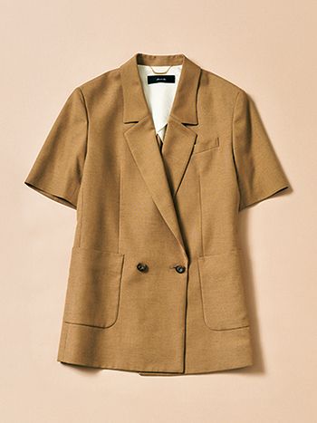 ベージュハーフスリーブジャケット/アルアバイル Tシャツのように軽快な半そでジャケット。リネンがまざっていることで、暑苦しさなくインテリ気分に。体のラインを補整できる長めの丈で、ゆるいデニムをはく日もスマートな見た目を維持。