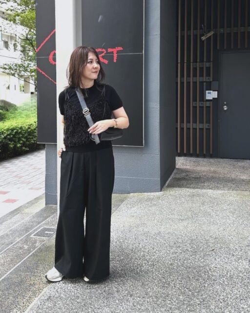 黒ワイドパンツ×黒トップスのワンツーコーデは大人にとって少し物足りなく感じるものです。そこでおすすめなのが、同色の黒キャミソールを重ねる着こなし方。黒同士だから主張しすぎず、それでいてコーデに奥行きが生まれるのがメリット。