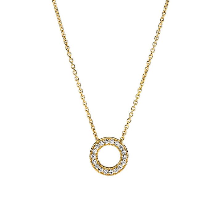 キュービックジルコニアがパヴェセッティングされたオープンサークルのペンダントヘッドが印象的。側面には、カットワークのハートが一周配され、軽やかでスイートなデザイン。ベーシックであり、デイリーにつけやすいサイズ感がうれしい。