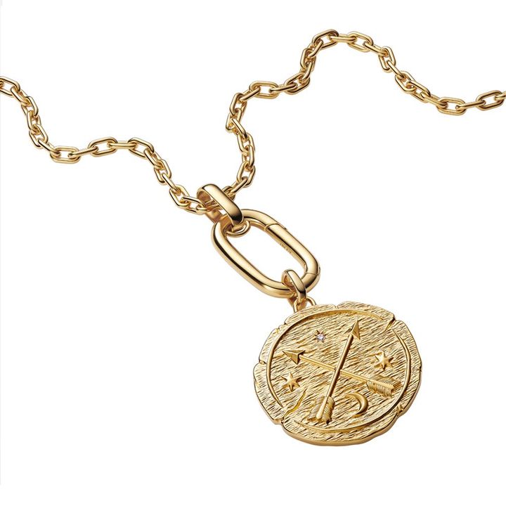 開閉可能なリンクがトップについた、自由にカスタマイズできるチェーンネックレスと、交差する矢とラテン語の「AD MELIORA(より良いところへ)」という碑文が刻まれた、気分をエナジャイズしてくれるメダリオンチャームをスタイリング。