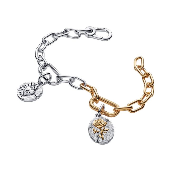 ゴールドとシルバーのコンビがスタイリッシュなチェーンブレスレットに、2つのメダリオンチャームをつけて。花開くバラとラテン語の「ROSA INTER SPINAS CRESCIT(茨の中に咲くバラのように)」の刻印があしらわれたチャームと、燃えるハートとラテン語の「AMOR VINCIT OMNIA(愛はすべてを征服する)」が刻まれたチャームがおしゃれなアクセントに。