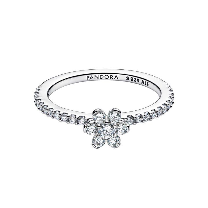 ストーンがハーフセッティングされたバンドの中央に、透明感のある7粒のキュービックジルコニアで象られたフラワーが輝く可憐なリング。細身のデザインで、1本でつけたり他のリングと重ねたり、アレンジして楽しさが広がる1本。