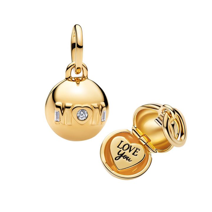母の日や出産祝いなどのギフトにぴったりなボールチャーム。表面には、“MOM”という立体的な文字と3粒のきらめくストーンがあしらわれ、さらにボールを開けると“Love you”のメッセージが刻印された遊び心のあるデザイン。