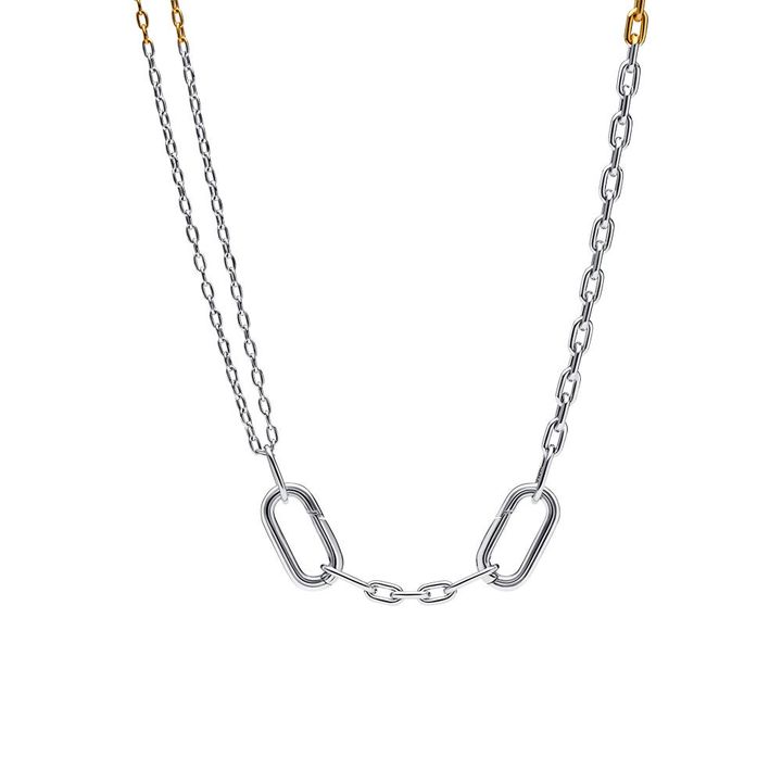 スレッドラインがアクセントになった2つの開閉リンク付きのチェーンネックレス。ネックレスの半分と開閉リンクをつなぐのは、太めのリンクチェーン、そしてもう半分はダブルチェーンが使用されたデザイン性の高い1本。チャームをつけて楽しんだり、ネックレス単品でも使ってもおしゃれ。