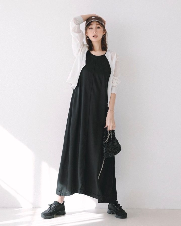 4月25日(土)、週末はキャップ&スニーカーで黒ワンピをラフに着こなしたい。そんなときに役立つのがシアーカーディガン。軽やかな透け感を重ねるだけで、カジュアルな着こなしに旬の質感が加わって一気に今っぽくなります。ラフになりすぎないのは、品よい透け感のおかげ。スポーティな小物合わせでも、きれいめなムードをキープできる大人の週末コーデです。