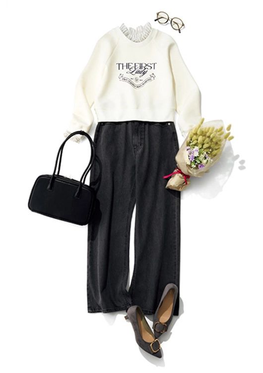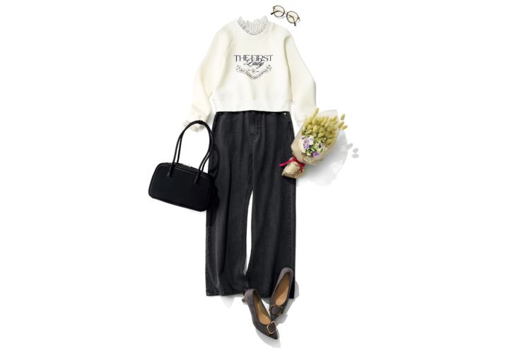 デニムカーブパンツ¥3,960/神戸レタス デタッチャブルスウェット¥17,600/CELFORD ルミネ新宿2店 ボストンバッグ¥2,990/GU モチーフ付きパンプス¥7,900/オリエンタルトラフィック(ダブルエー) メガネ¥1,290/GU 花/編集部私物