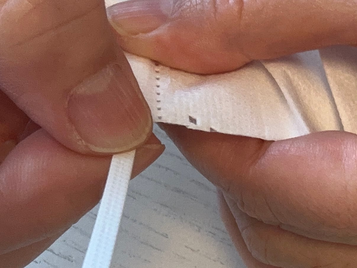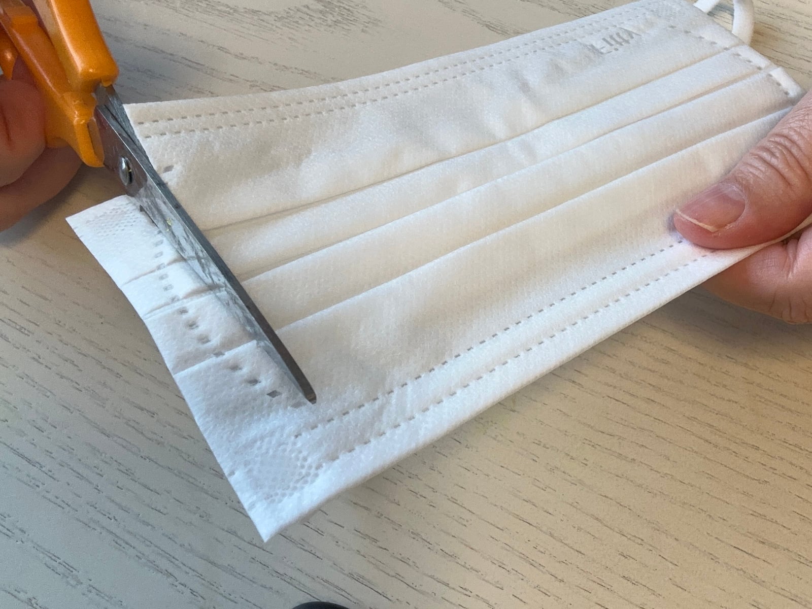 不織布のマスクは薄い生地が2~3枚重なっているので、袋状に広げます。袋状にしたら重曹を入れます。今回は、小さじ2杯ほど入れました。