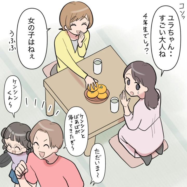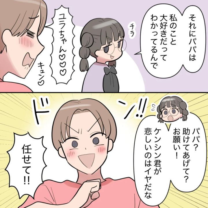 「ケンシンはもう大切な息子じゃないの?」と涙を流す私に、やっぱり「家族を支えたい」と一点張りのシンジを見て、呆れてその場を離れました。そして後日、実家で今回のことを話すと、義妹リンさんと一緒に話を聞いていた姪っ子ユラちゃんが「うちのパパと遊べばいいんじゃない?」と言い出して目から鱗!突然の出来事に驚きました。