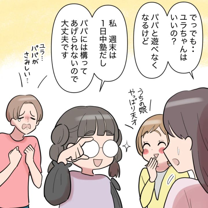 「でっでも・・ユラちゃんはいいの?パパと遊べなくなるけど」私がそう言うと、「私、週末は1日中塾だし、パパには構ってあげられないので大丈夫です」と冷静に答えるユラちゃんを見て、リンさんが「うちの娘やっぱり天才」と絶賛するなか、「ユラ・・パパがさみしい・・」コウタロウさんが寂しそうに言いました。
