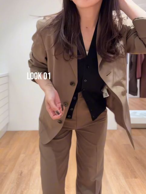 ライトブラウンのセットアップを主役にした、都会的で落ち着きのあるコーディネートです。asamimiiiiさんは、UNIQLO Uの「テーラードジャケット」値下げで1,990円(サイズ不明)と「ハイライズストレートパンツ」値下げで3,990円、ともに56 オリーブを合わせたスタイルを披露。