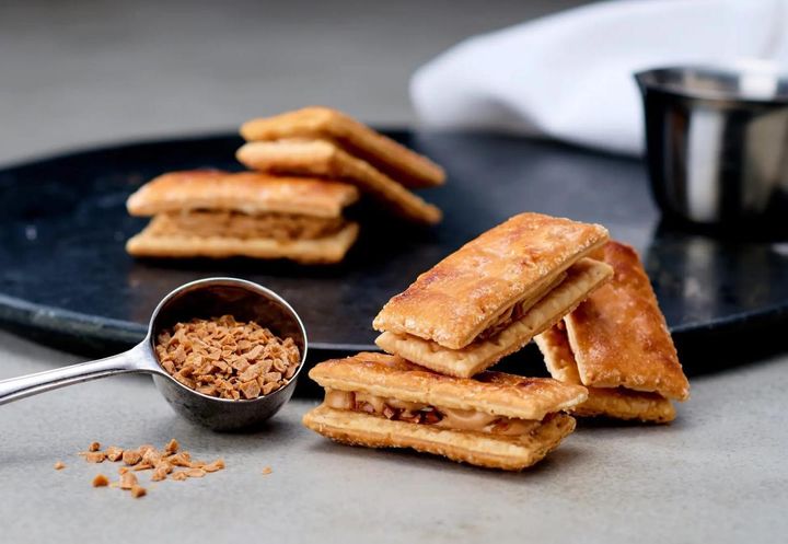 表面をパリッと香ばしくブリュレしたパイで、甘くほろ苦いキャラメルクリームをサンド。サクサクの食感と濃厚なキャラメルの風味が楽しめます。