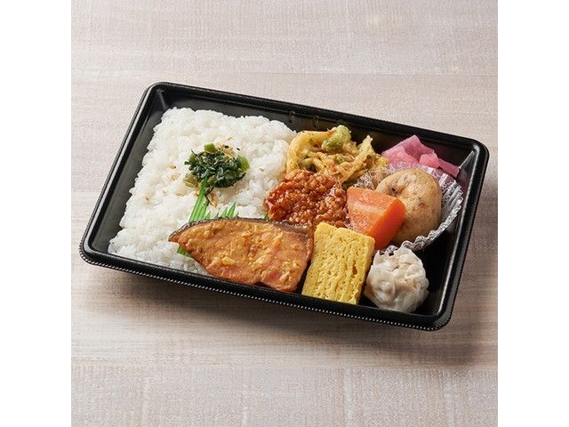 銀鮭の西京焼きをメインに、煮物、厚焼き玉子、かき揚げ、シュウマイを盛り付けた幕の内弁当です。 中国、四国、九州で販売