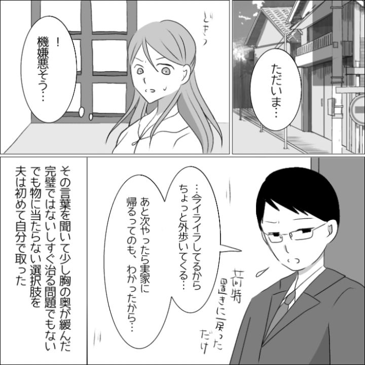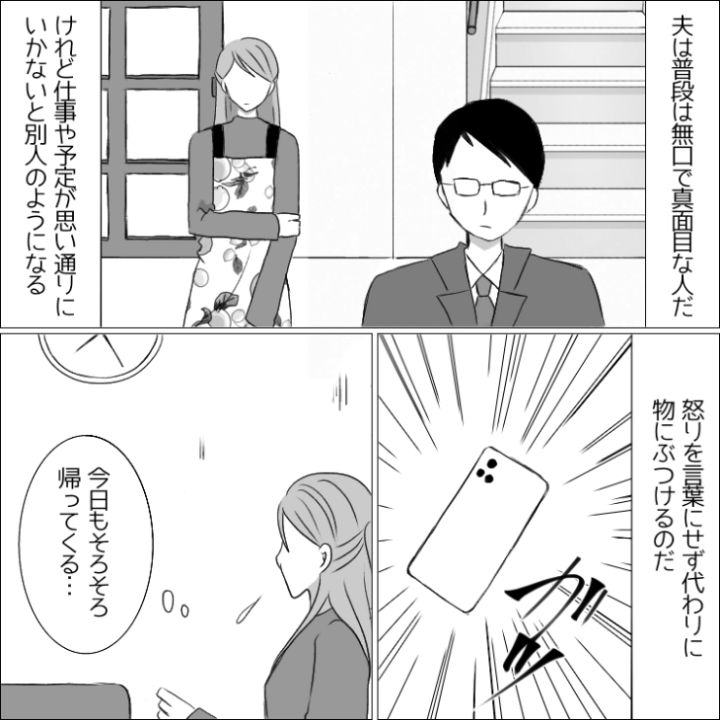 主人公の夫は普段無口で真面目な人間だが、何か思い通りにならないことがあると物にあたって壊す癖があって・・・。
