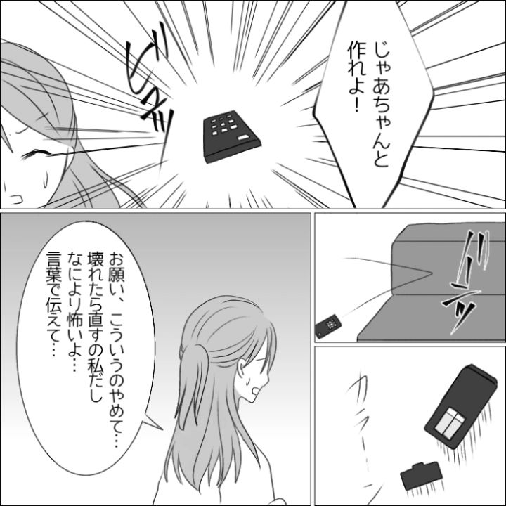 3. 「じゃあ、ちゃんと作れよ!」料理の味が薄いとリモコンを投げたり机を叩いたりする夫!イライラすると物にあたって壊す癖をやめてとお願いしても逆ギレ
