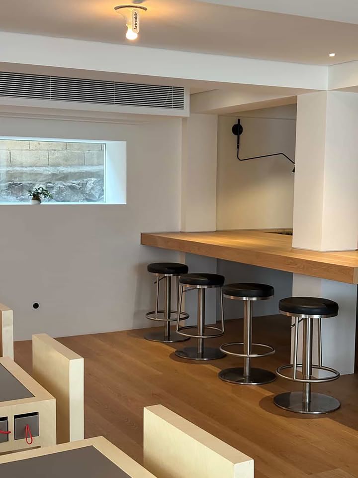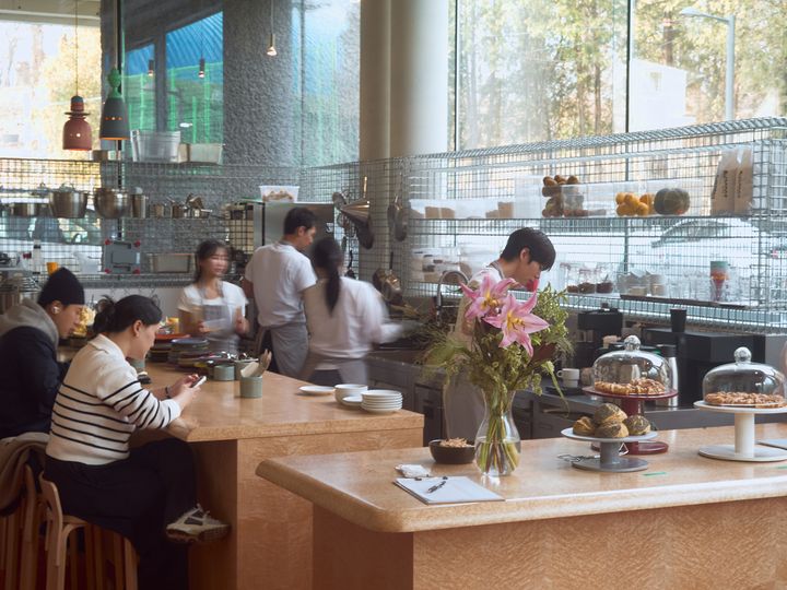 コンクリートの建物に足を踏み入れると、目に飛び込んでくるのは鮮やかなオレンジカラー。朝早くから営業する空間ならではのエネルギーが視覚的に表現されており、公園での散策後に訪れた際には、身体がゆっくりと目覚めていくような感覚をもたらしてくれる。