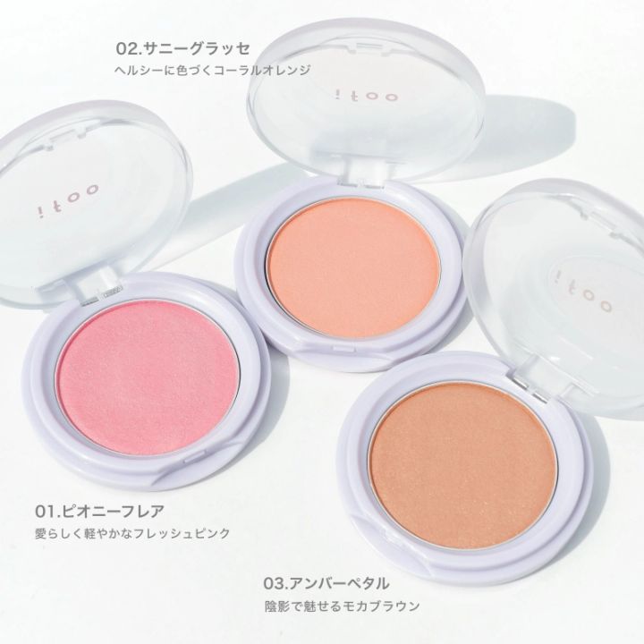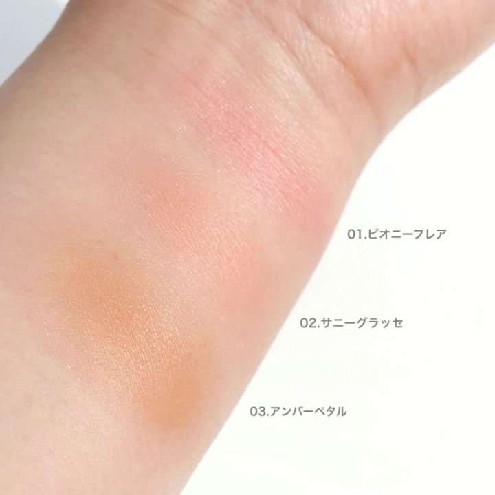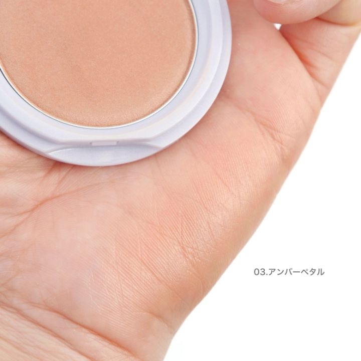 またほんのりパールが配合されていることで、ハイライトを重ねなくても頬に立体感が生まれるのもポイント♪03 アンバーペタルはシェーディングにも使えます!
