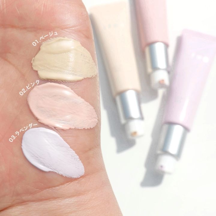 それぞれカラーコントロール下地としても使えるくらいの発色。さらに下地にしては珍しい、少しだけ重ためなテクスチャーが特徴で、この絶妙な重さこそ千吉良さんのこだわりです。発表会でも「このテクスチャーだからこそしっかり肌にフィットし、肌表面をフラットに整えてくれる」と教えて下さいました。3種類のパウダーを配合し、毛穴の凹凸も限りなく均一にカバーしてくれるほか、トーンアップ効果も高いので肌の明るさや印象を華やかにしたい方は是非♪