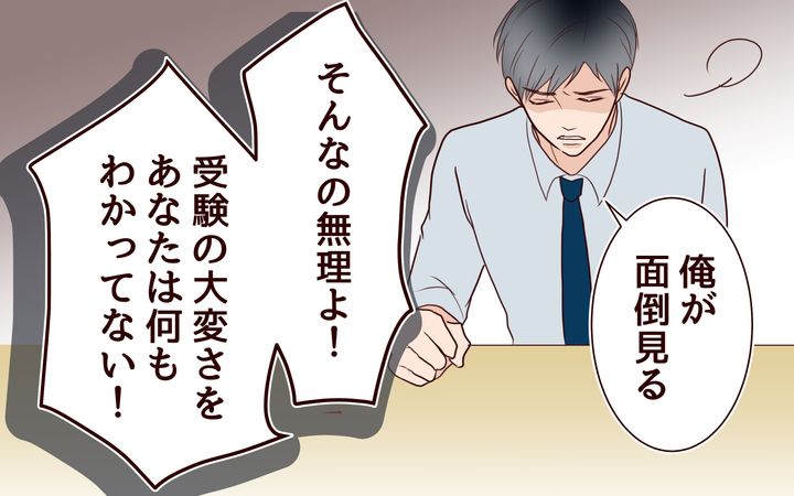 私は夫から、ウィークリーマンションで息子のこと、そして自分のことを「考えてこい」と言われ…。私がいなくなったら、誰が息子の面倒を見ると言うのでしょう? 息子だって嫌がるはずです。食事だって、勉強のスケジュールだって、私が全部やっていたのだから。なのに、受験の厳しさを何もわかってない夫が「面倒を見る」と宣言。そんなの息子だってお断りのはず。