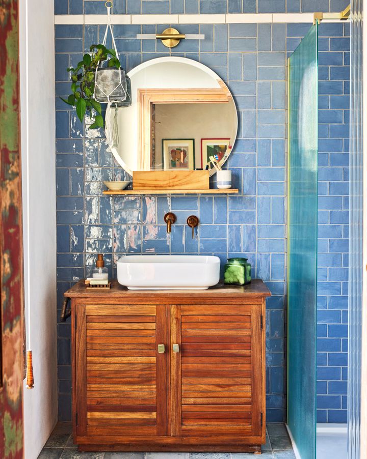 「タイルを格子状に重ねたり、互い違いに並べたり、縦にしたりと、さまざまなパターンで敷き詰めることで、空間をさりげなく分けることができます」と語るのは、石やタイルを扱う会社「Ca’ Pietra」のクリエイティブ・ディレクター、グラッツィ・ウィルソンさん。「これはシンプルなアイデアですが、単なる機能的な空間に視覚的な面白みを加えてくれます」