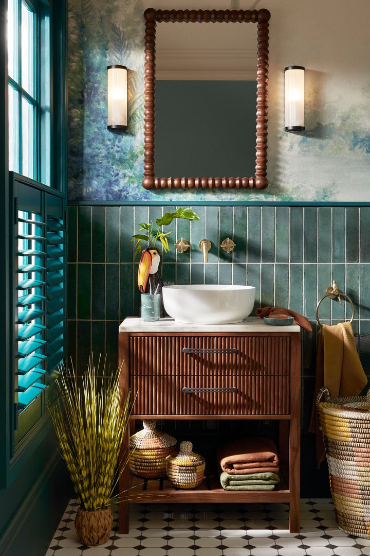 節約を考えるなら、細部にこだわってみましょう。遊び心のあるバスマット、手頃な価格の小物、そして慎重に選んだ壁の色は、予算を圧迫することなく空間の雰囲気を一変させてくれます。深みのある青、落ち着いた緑、温かみのあるニュートラルカラーなど、大胆な色合いの塗料を使うのも、タイルに手を加えることなく高級感を演出する賢い方法です。