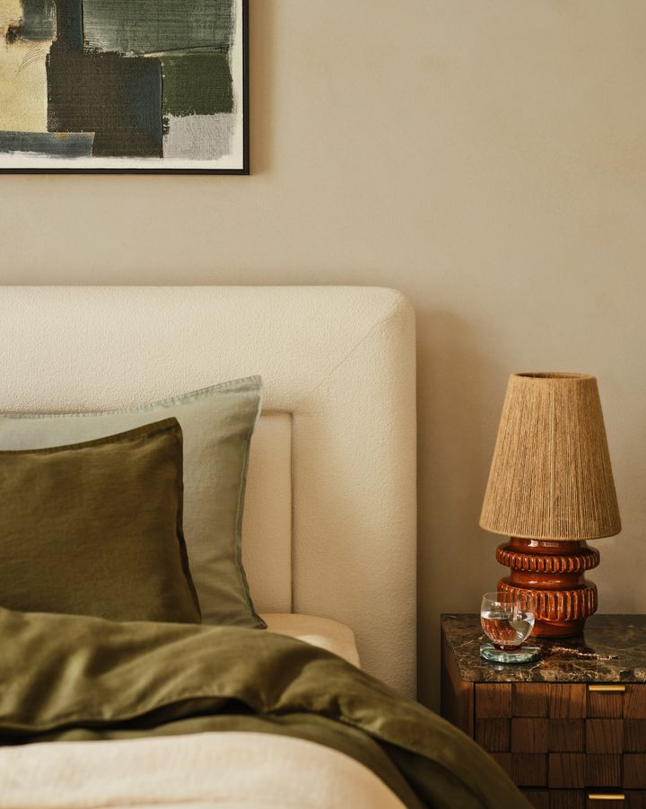 一方で、寝室に重厚感と高級感を加えるのに、必ずしも高額な費用をかける必要はありません。装飾的なクッションや手頃な価格のベッドサイドランプを使えば、予算を圧迫することなく、スタイリッシュで調和のとれた空間を演出できます。寝具についても同じ。ニュートラルカラーのベーシックな素材を選び、気分に合わせてスローケットやアクセントアイテムでアレンジしましょう。大手ブランドでは、綿100%や麻100%の寝具セットをリーズナブルな価格で多数販売しています。