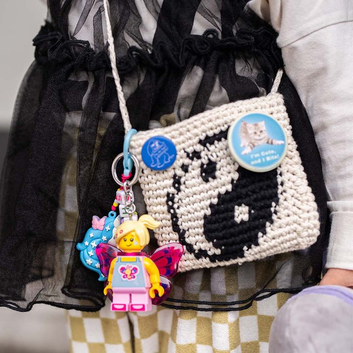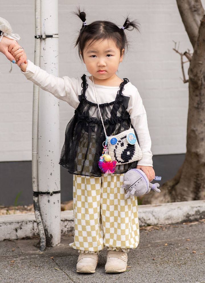 陰陽モチーフが好アクセントなクロシェポシェット。ポップなチャームを添えて、キッズらしい自由なコーデに昇華!