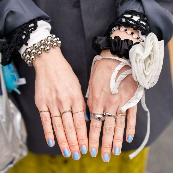 リングやプレスレットをレイヤードした、リズミカルな手元に注目! シルバーとモノトーンで揃えて、統一感アップ♪