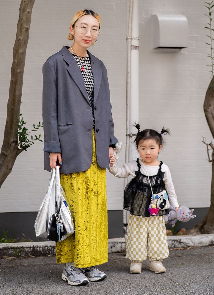 メッシュのトップスやチュールのビスチェなと、ワンアイテムをレイヤードするだけで一気に奥行きのあるコーデになる。親子でブラック×ピスタチオグリーンで揃えて、ヘアアレンジも仲良しリンク♪ モード感漂うおしゃれ春コーデの完成!