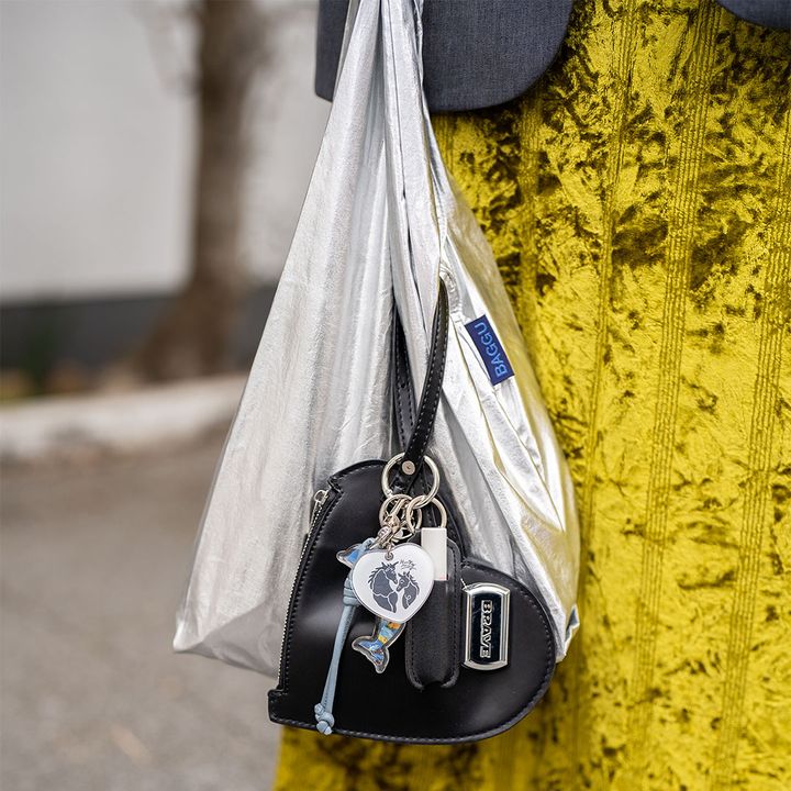 シルバーバッグに『フレディ エミュ』のブラックポーチをぶら下げて。チャームをたっぷり飾ったカスタマイズもおしゃれママならでは。