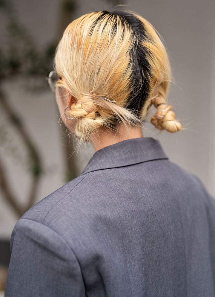 ハイトーンヘアがアクセサリー代わりに大活躍! タイトに結んだお団子でモードな雰囲気を漂わせて。