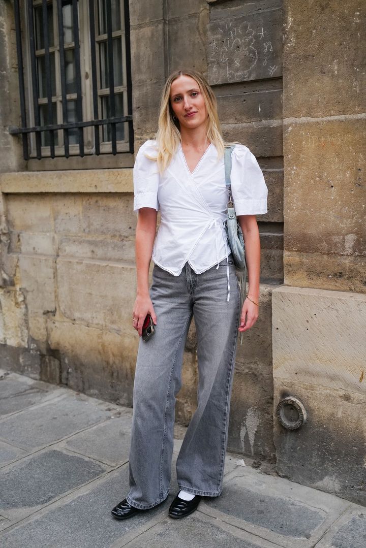 「プルアンドベア」のグレーデニムがワードローブのエッセンシャル。この日は、「ガニー」のラップシャツやライトブルーの「バレンシアガ」の“ル シティ”を合わせて、涼やかなスタイルにまとめていた。