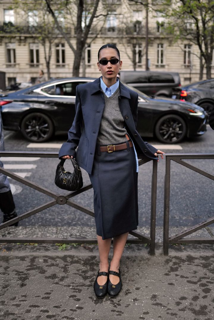 ネイビーのセットアップにグレーのニット、ブルーのシャツをレイヤード。ユニフォームライクな着こなしに、「ミュウミュウ」のバッグ“ワンダー”やバレリーナシューズを合わせることで、チャーミングなエッセンスをプラス。