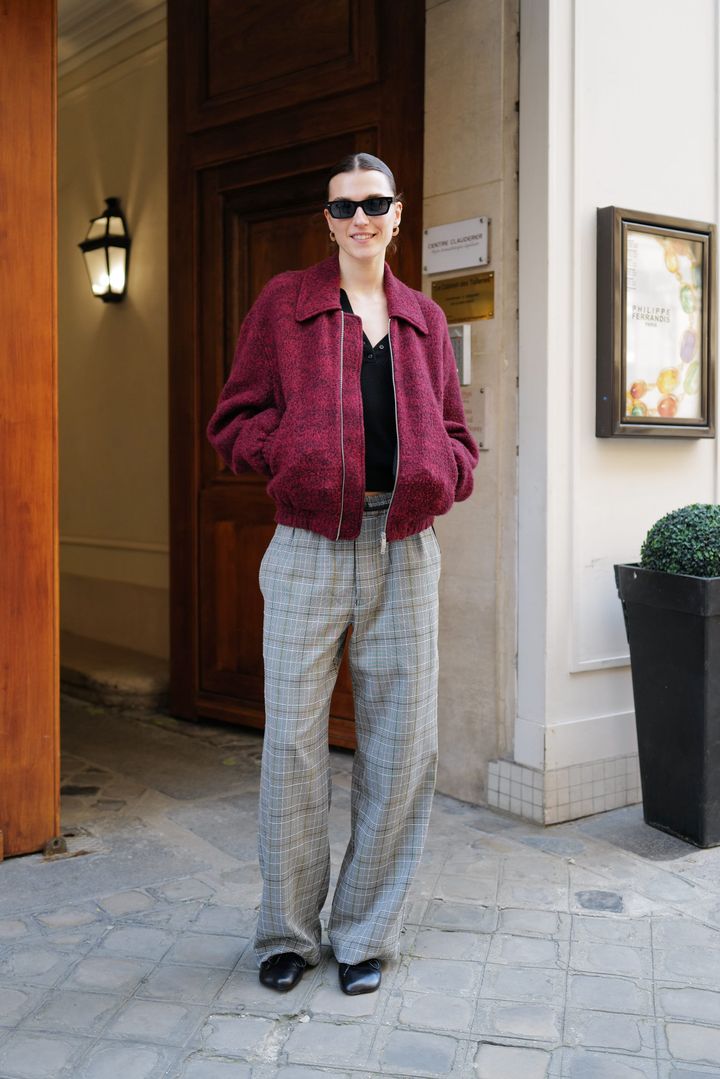 イリナのお気に入りは「ジル サンダー」のレッドカラーのブルゾン。ニットシャツ、ゆったりとしたチェック柄のパンツをコーディネートして、力の抜けたモードスタイルを楽しんでいた。「オリバーピープルズ」のサングラスもクールなスパイスに。