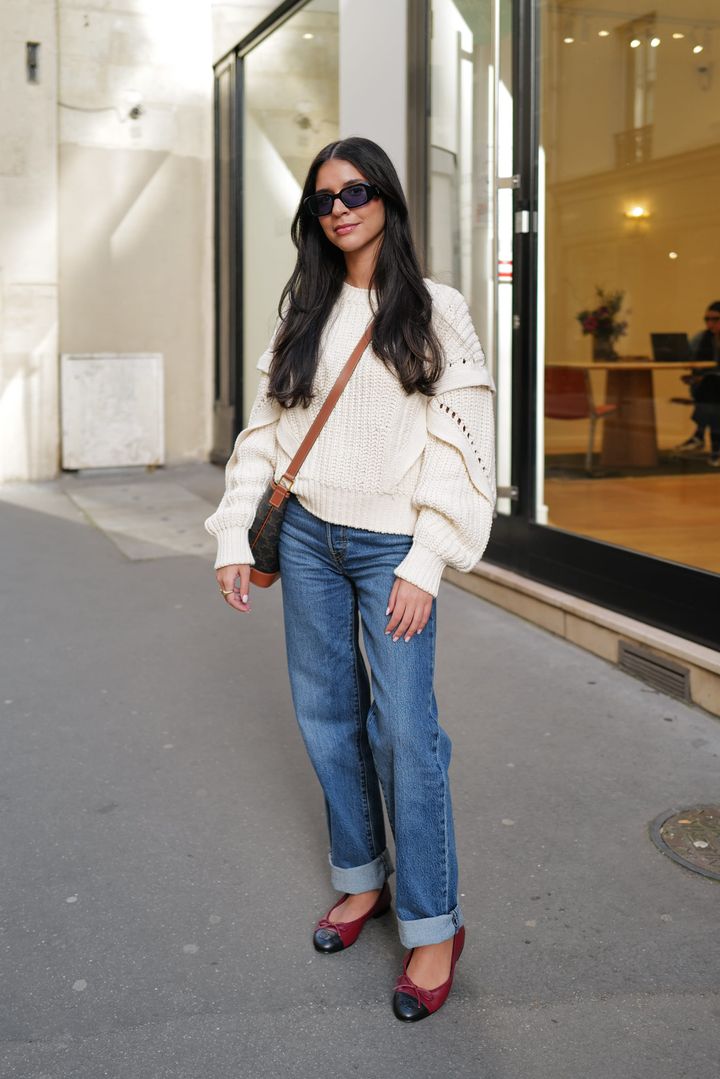 バレエシューズが際立つよう、デニムはロールアップしてバランスをとって。洗練されたバイカラーがブルーデニムコーデをクラスアップ。