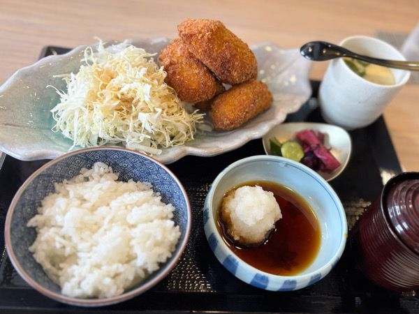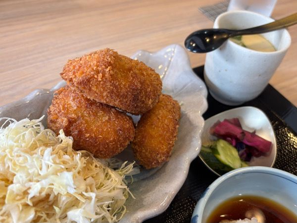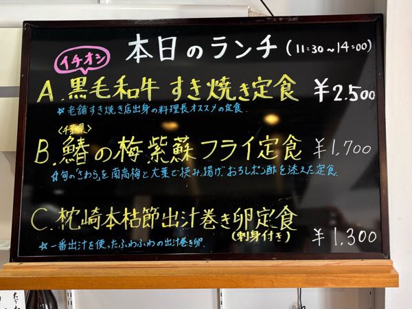 長く老舗すき焼き店にいらっしゃった料理長が手掛ける「黒毛和牛すき焼き定食」2,500円にも惹かれましたが、今回は旬のお魚を使った「鰆の梅紫蘇フライ定食」1,700円と「枕崎本枯節出汁巻き卵定食」1,300円をお願いしました。