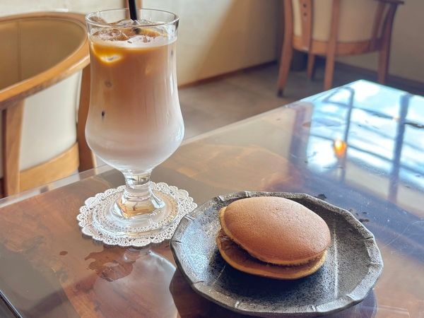「どら焼き」と「アイスカフェオレ」を店内でいただくことに!お会計後に好きなお席を選び、数分のんびり待ちます。