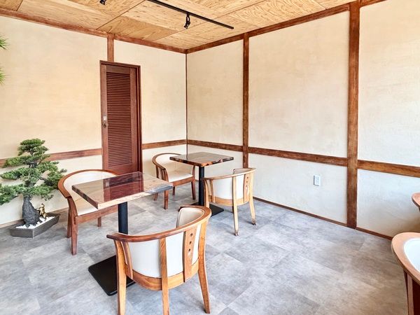 併設の喫茶コーナーにはカウンター・テーブルが計7席。木の温もりあるシンプルな空間で、好みのスイーツやドリンクが楽しめます。