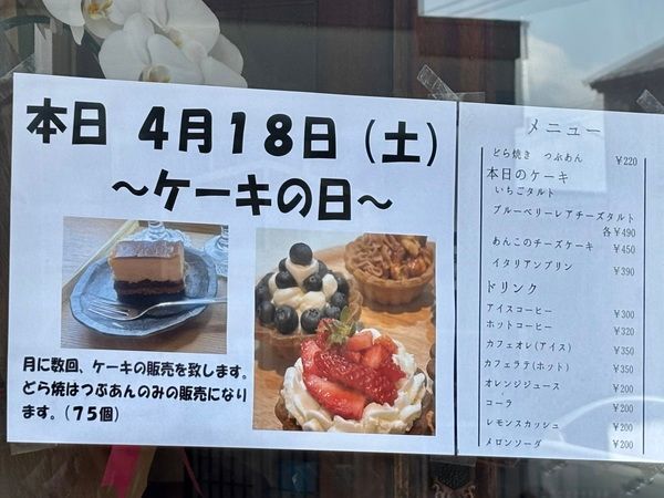通常メニューは洋菓子の代わりに、クリームを使ったどら焼きとあんバターサンドが登場!ドリンクはケーキの日と同じラインナップです◎