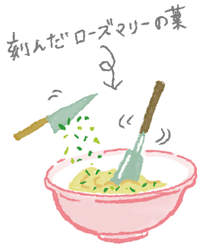 細かく刻んだローズマリーの葉小さじ2を、常温にもどしたバター(食塩不使用)50gとよく混ぜ、好みでこしょうやにんにくのすりおろしを混ぜて。トーストに塗るほか、魚や肉のソテーに使うと臭みを消して風味がアップ。