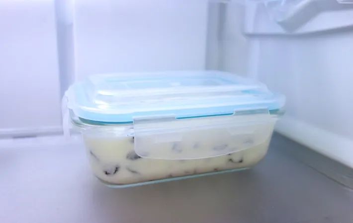 まずは、ヨーグルトとレーズンを保存容器に入れ、よく混ぜます。