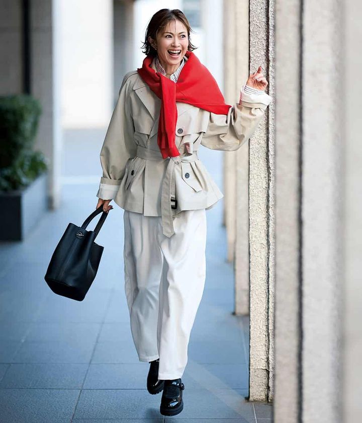 シューズ¥85,800(レペット/ルック ブティック事業部)トレンチコート¥18,920(ミラ オーウェン ルミネ新宿2店)シャツ¥13,200(グリーンバター/ジャック・オブ・オール・トレーズ プレスルーム)肩にかけたニット¥29,700(ザ シンゾーン/シンゾーン 表参道本店)パンツ¥22,000(カデュネ)バッグ¥218,900(ミチノ・パリ/アマン)ネックレス¥104,500ピアス¥52,800(ともにエンド カスタム ジュエラーズ×ハイク/ボウルズ)