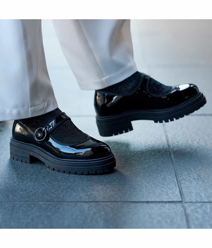 スニーカー級の機動力とメリージェーンの洒落感を両立。本気で走れるから忙しい日には最適。仕事も学校のお手伝いスタイルにも品よく馴染む光沢ネイビー。