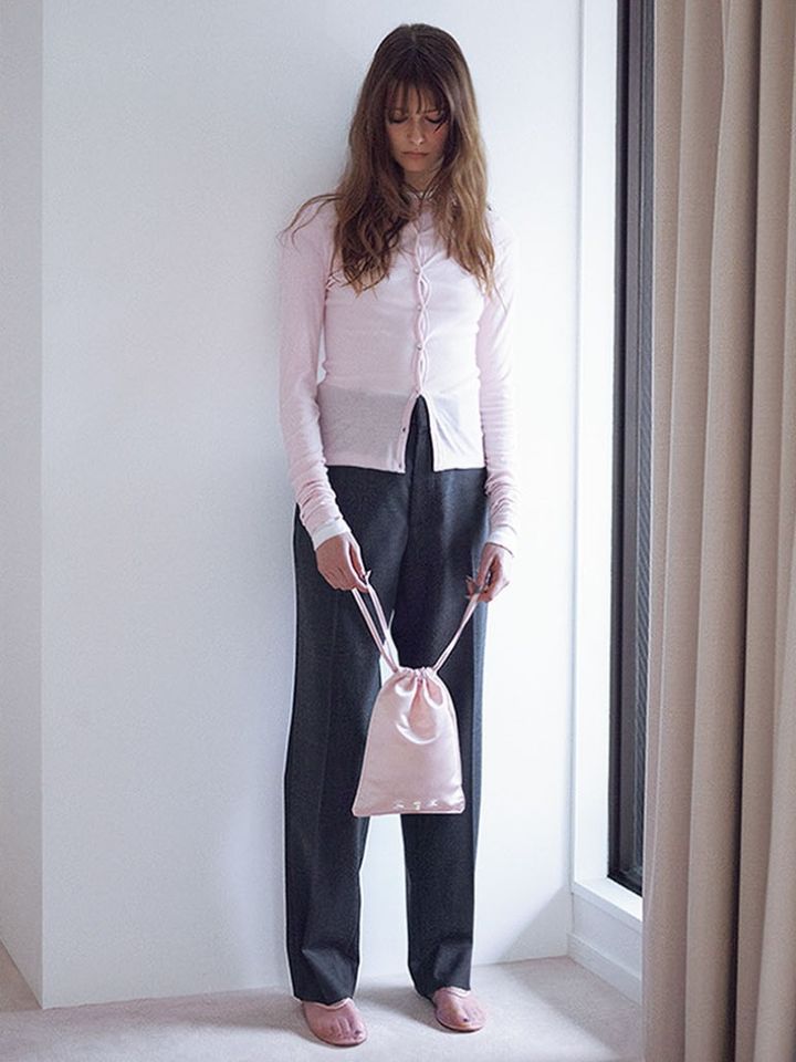 【POINT】やわらかいピンクをちりばめて、ハンサムなグレーのパンツを角のとれたやさしげなたたずまいに。メリハリのあるゆるさで調和のとれたエフォートレス。