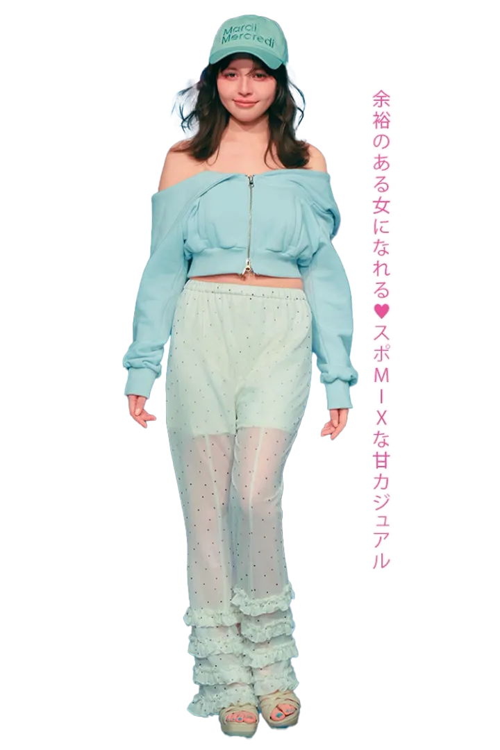 〈ナナ〉オフショルパーカ 15,180円/lilLilly(lilLilly TOKYO)ドットシアーパンツ 9,790円/être loin キャップ 6,050円/Mardi Mercred(i MARDI MERCREDI JAPAN)サンダル 14,300円/rienda(バロックジャパンリミテッド)