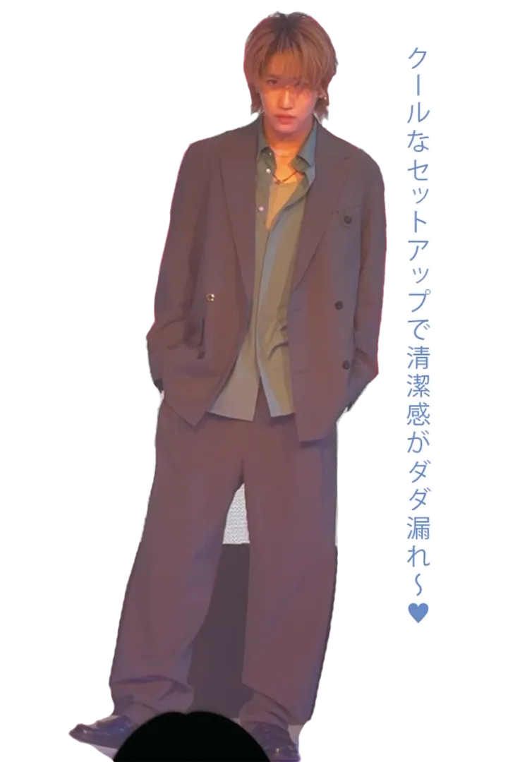 〈福澤〉ジャケット 71,500円、ワイドパンツ 46,200円、シャツ 29,700円/以上CULLN(I シアンPR)タンクトップ 2,200円/Hanes(ヘインズジャパン)ローファー 16,500円/原宿シカゴ 原宿店 チェーンネックレス 3,300円/LION HEART(シアン PR)ネックレス/スタイリスト私物