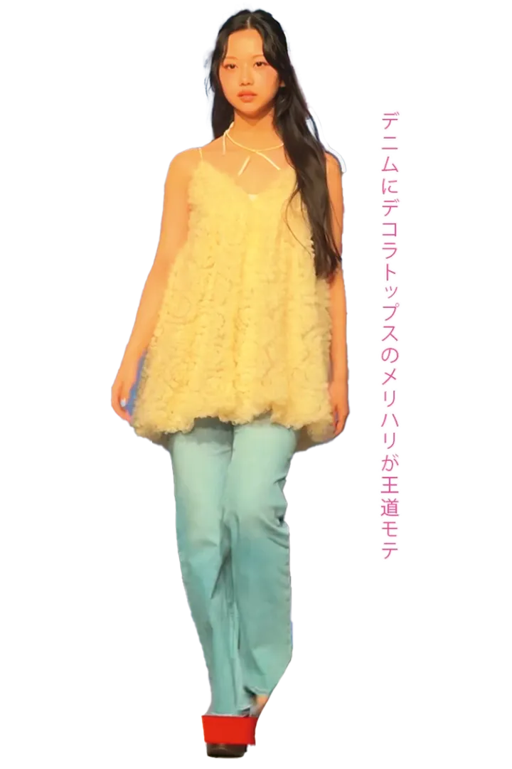 〈琉〉チュールミニドレス 11,500円/NOTRE émo(r SORA)デニムパンツ 12,100円/COCO DEAL(ココ ディール)リボンバレッタ 550円/PHILLY ネックレス 2,200円/I AM THE 1(レイジーワークス)サンダル 15,990円/ZARA(ザラ)