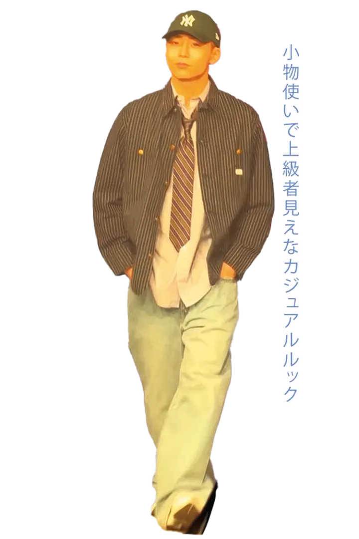 〈八村〉ストライプシャツ 7,150円、ネクタイ 4,290円/ともに原宿シカゴ 原宿店 ストライプジャケット 18,700円/Lee、デニムパンツ 15,400円/EDWIN(ともにエドウイン)キャップ 4,620円/New Era® スニーカー 19,800円/New Balance(ニューバランスジャパン)