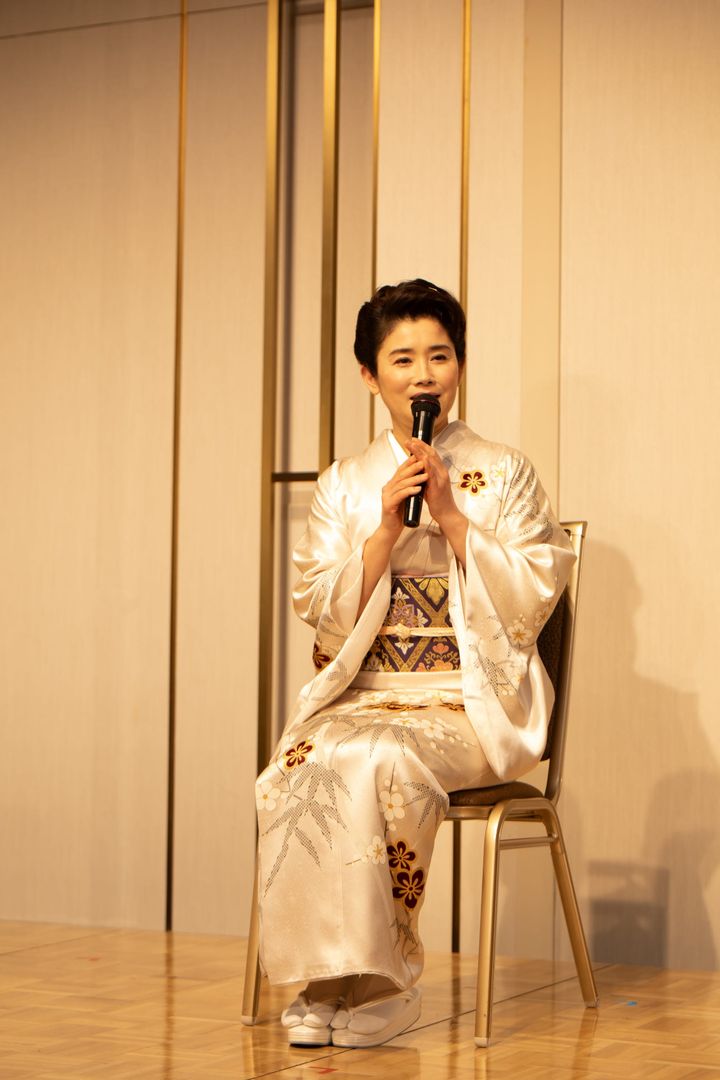 『美しいキモノ』創刊70周年を記念し、「オークラ東京」で開催したパーティでは、スペシャルゲストとしてご登場くださった石田さん。ツヤやかな白地に松竹梅を描いた「千總」の訪問着をお召しになった麗しい姿に、会場からは感嘆のため息が。